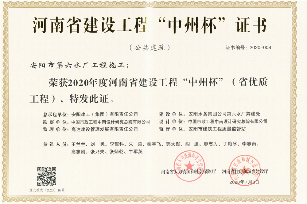 安陽市第六水廠等三項工程獲得2020年度河南省建設(shè)工程“中州杯”獎