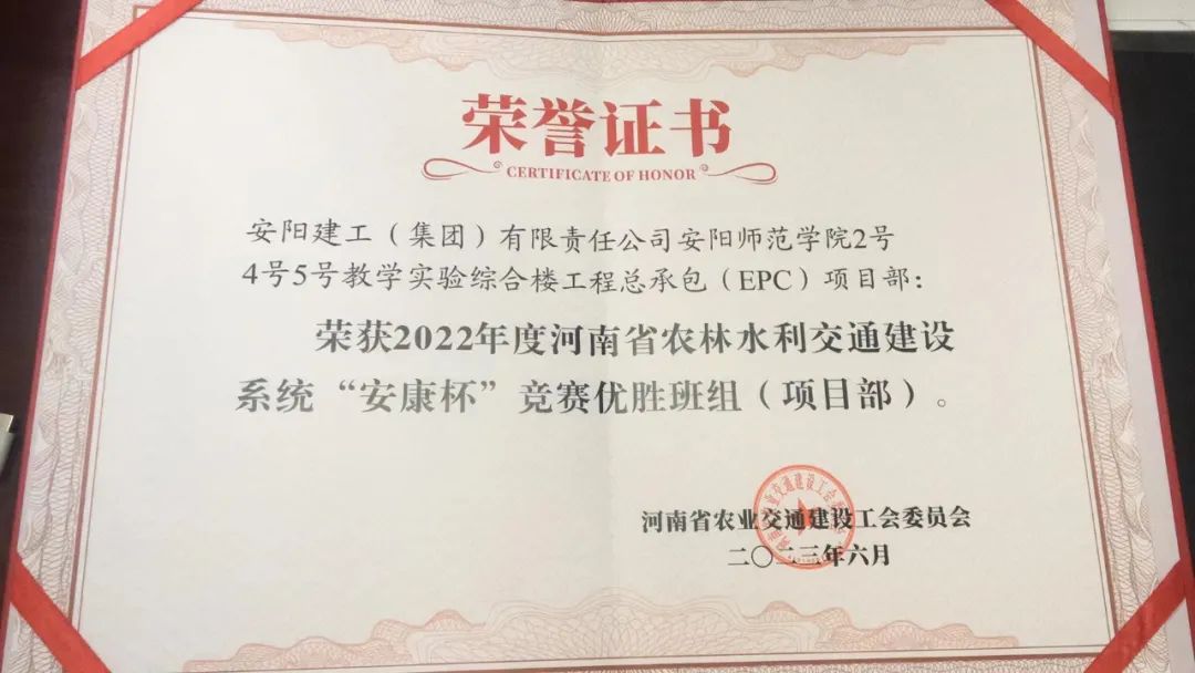 近日,河南省農(nóng)業(yè)水利交通建設工會豫農(nóng)業(yè)交通建設工【2023】19號文件 ,對2022年度全省農(nóng)業(yè)水利交通建設系統(tǒng)“安康杯”競賽活動優(yōu)勝單位、優(yōu)勝班組、優(yōu)秀個人和優(yōu)秀組織單位進行通報表揚。安陽建工(集團)有限責任公司安陽師范學院2號4號5號教學實驗綜合樓工程總承包(EPC)項目部榜上有名,被授予“優(yōu)勝班組(項目部)”稱號。