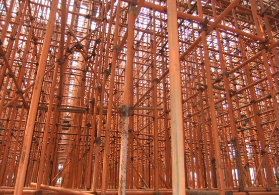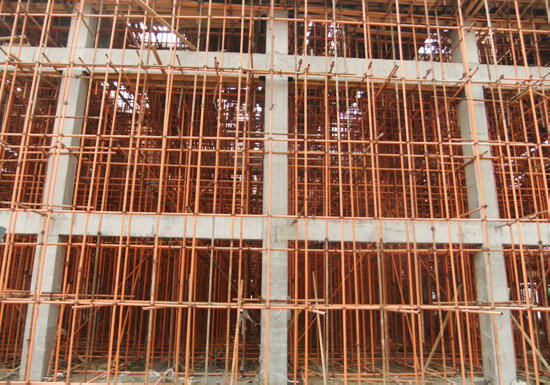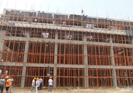 安陽建工邯鄲分公司承建的臨漳文化藝術(shù)中心項目,占地150畝,建筑面積13165平方米,計劃投資4500萬元,集大型會議中心、文化演藝中心、影視播放中心、群眾文化活動中心為一體。其中會議大廳跨度20米,高13.5米,長40米,附跨高度8.5米,建筑面積約2000平方米,結(jié)構(gòu)施工為高支模系統(tǒng),是本工程的難點和重點。施工前,公司工程部及技術(shù)中心組織了支模方案論證,并多次到現(xiàn)場指導(dǎo)施工,進行模板驗收,制定澆筑方案。7月15日進行砼澆筑,采用兩臺泵車,經(jīng)過10個小時的澆筑,順利完成會議大廳結(jié)構(gòu)施工。