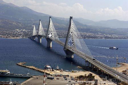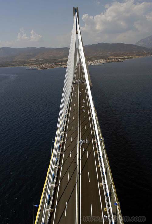 數(shù)千年的地殼運動造成了希臘的伯羅奔尼薩半島和大陸的分離,而今年8月建成的、橫跨科林斯海灣里永-安蒂里永大橋?qū)⒈蛔匀唤绶蛛x了幾千年的這兩塊陸地連接在了一起。它不僅僅是世界上最長的斜拉橋—橋面直接用懸索吊在龍門架上,而且還是世界上技術(shù)最先進的橋梁之一。