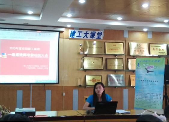 備戰(zhàn)一建,誓奪佳績。5月20日下午3:00建工大課堂——“2015年度一級建造師考前動員大會”準(zhǔn)時在公司三樓會議室召開。公司董事長、總經(jīng)理謝海如,副總盧麗娜以及新老考生參加了會議。