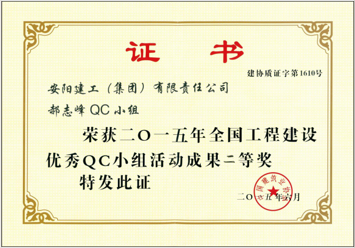 2015年6月22日—25日,中國建筑業(yè)協(xié)會工程建設(shè)質(zhì)量管理分會在云南昆明召開了“2015年全國工程建設(shè)優(yōu)秀QC小組活動成果交流會”,對2015年優(yōu)秀QC小組活動成果進(jìn)行了交流、表彰。我公司郝志峰QC小組活動成果參加此次交流會,并榮獲“2014年全國工程建設(shè)優(yōu)秀QC小組活動成果二等獎”的榮譽(yù)稱號。