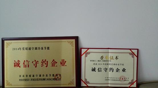 2015年7月21日,河南省建筑暖通節(jié)能企業(yè)表彰及座談會在鄭州召 開,我公司喜獲2014年度暖通空調(diào)冷凍節(jié)能“誠信守約企業(yè)”榮 譽,全省共有13家機電安裝企業(yè)獲此榮譽。這是業(yè)界對我公司在 建筑暖通空調(diào)領域推進行業(yè)健康發(fā)展、關注生態(tài)環(huán)境、踐行低碳 環(huán)保理念所作工作及公司綜合品質(zhì)的肯定。