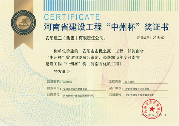 我單位承建的“安陽(yáng)市市民之家”工程榮獲2015年度河南省建設(shè)工程“中州杯“獎(jiǎng)”