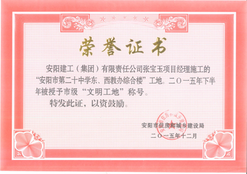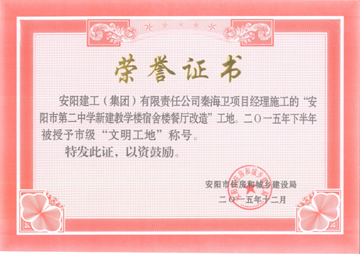 在2016年開工的第一周,從安陽市住房和城鄉(xiāng)建設局獲悉,我公司承建的“安陽市第二十中學教辦樓”、“安陽市第二中學新建教學樓宿舍樓餐廳改造”榮獲2015年度下半年市級安全文明標準化工地稱號。此次評選,市住建局協(xié)同相關(guān)部門嚴格按照《河南省安全文明工地評審辦法》和《安陽市安全文明工地評審辦法》,旨在鼓勵先進、鞭策后進、共同進步,對各施工企業(yè)申報的安全文明工地進行的一次檢查和評比。 工程部 玄麗