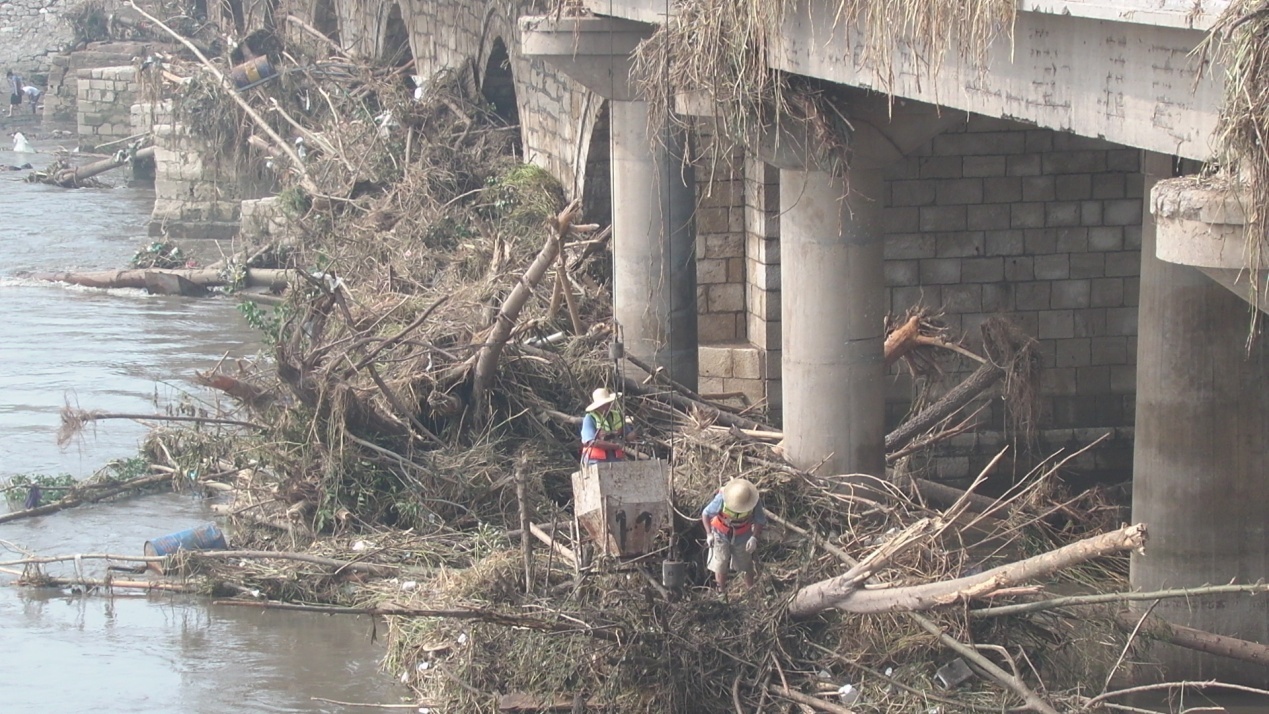 到達(dá)現(xiàn)場(chǎng)后,董事長(zhǎng)謝海如根據(jù)現(xiàn)場(chǎng)實(shí)際情況,制定方案與措施,組織員工開始防汛段清理工作,為了盡快完成任務(wù),清除河道大型樹干,特意調(diào)來四臺(tái)大吊車及一臺(tái)抓桿車協(xié)同工作。