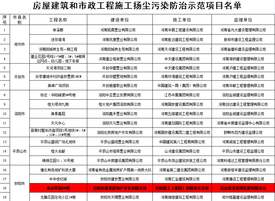自全省大氣污染防治攻堅以來,我公司承建的所有在建工地積極應對,洗車臺的配備、防塵網(wǎng)、灑水車、霧霾儀等一系列的應對措施,保障了在建工地綠色施工。其中,由我公司承建的“香山甲第6#”項目受到河南省住房和城鄉(xiāng)建設廳通報表揚,在此,向香山甲第項目部表示衷心的祝賀。 (辦公室 劉璐)