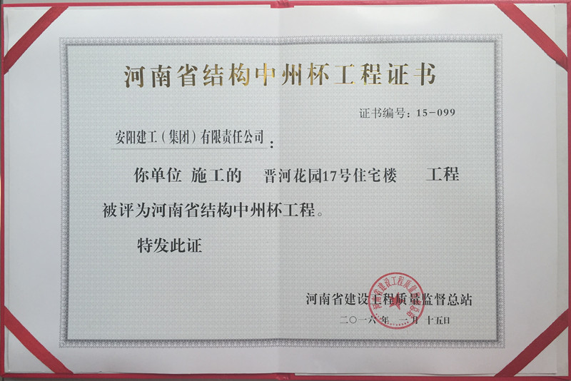 我單位承建的 晉河花園17號(hào)住宅樓 工程被評(píng)為河南省結(jié)構(gòu)中州杯工程