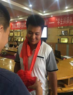 拜師儀式上,學(xué)生向自己的師傅鞠躬、敬茶,獻花,行拜師禮。指導(dǎo)老師代表原國瑞發(fā)言表態(tài),“一定恪盡職守,全力教導(dǎo),起到帶頭示范作用”,學(xué)生代表在隨后的發(fā)言中表示,“一定虛心請教,把師傅作為學(xué)習(xí)的楷?!?。