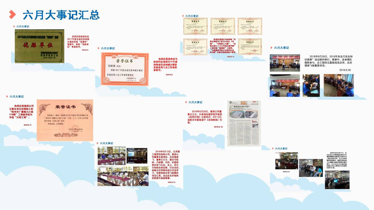 入夏以來,集團(tuán)公司各方面工作扎實(shí)推進(jìn)。夏初,我公司榮登2018年全市納稅前100名光榮榜及各縣(市)區(qū)納稅前10名企業(yè)榜;5月28日,集團(tuán)公司董事王蘭蘭、中易恒經(jīng)理李相平就裝配式技術(shù)推進(jìn)接受安陽日報(bào)記者采訪,該專題報(bào)道于6月13日刊登于《安陽晚報(bào)》。5月31日,每年一度的法人講安全如期舉行;6月13日,北京建工集團(tuán)蒞臨我公司參觀交流;6月22日非公企業(yè)民主管理集體協(xié)商工作觀摩調(diào)研培訓(xùn)座談會(huì)在我公司圓滿舉行,市總工會(huì)法律部李海燕部長、城建交通水利工會(huì)梁曦主席和其他單位領(lǐng)導(dǎo)參會(huì)。