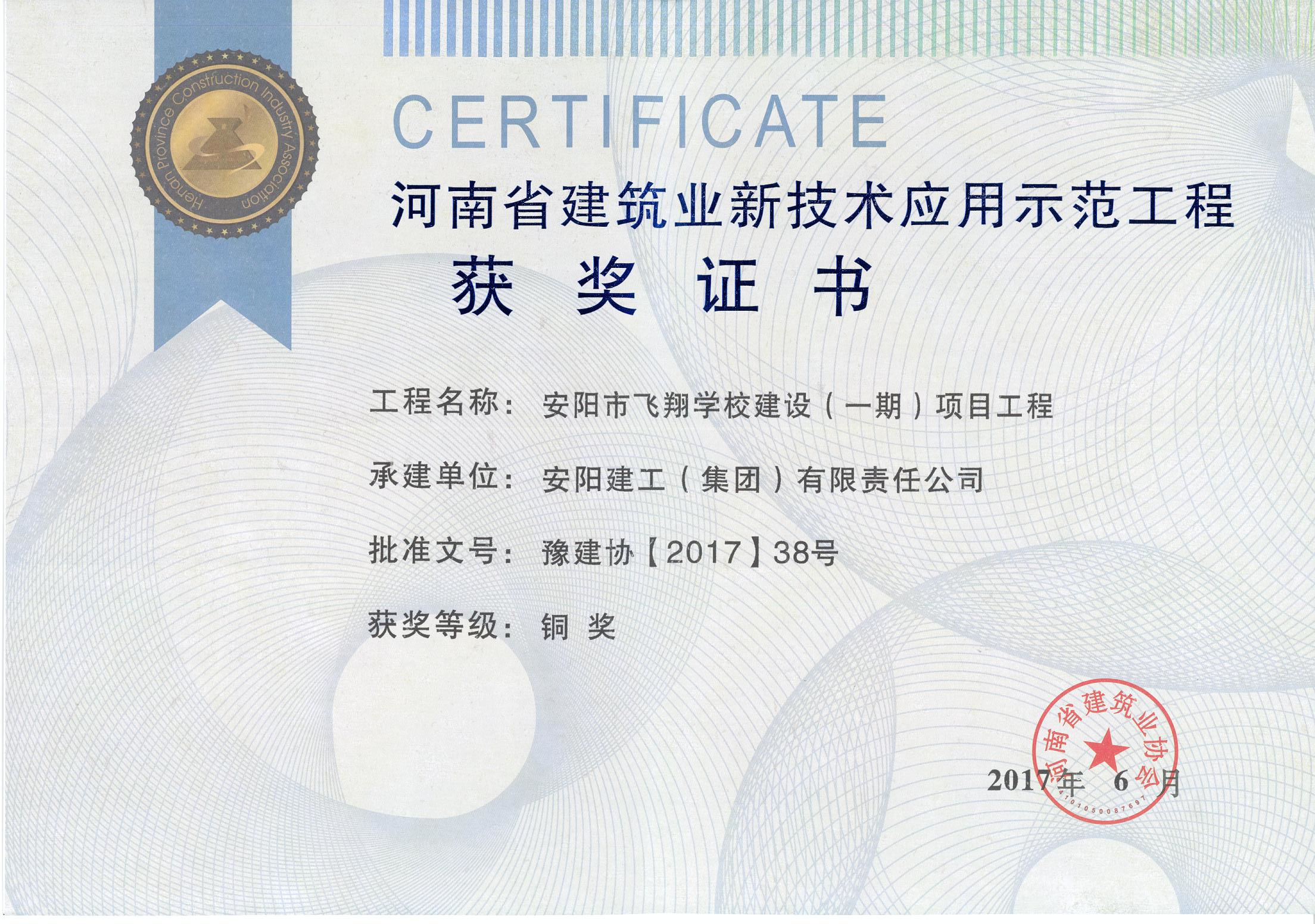 我公司安陽(yáng)飛翔學(xué)校項(xiàng)目榮獲17年省建筑業(yè)新技術(shù)應(yīng)用示范工程