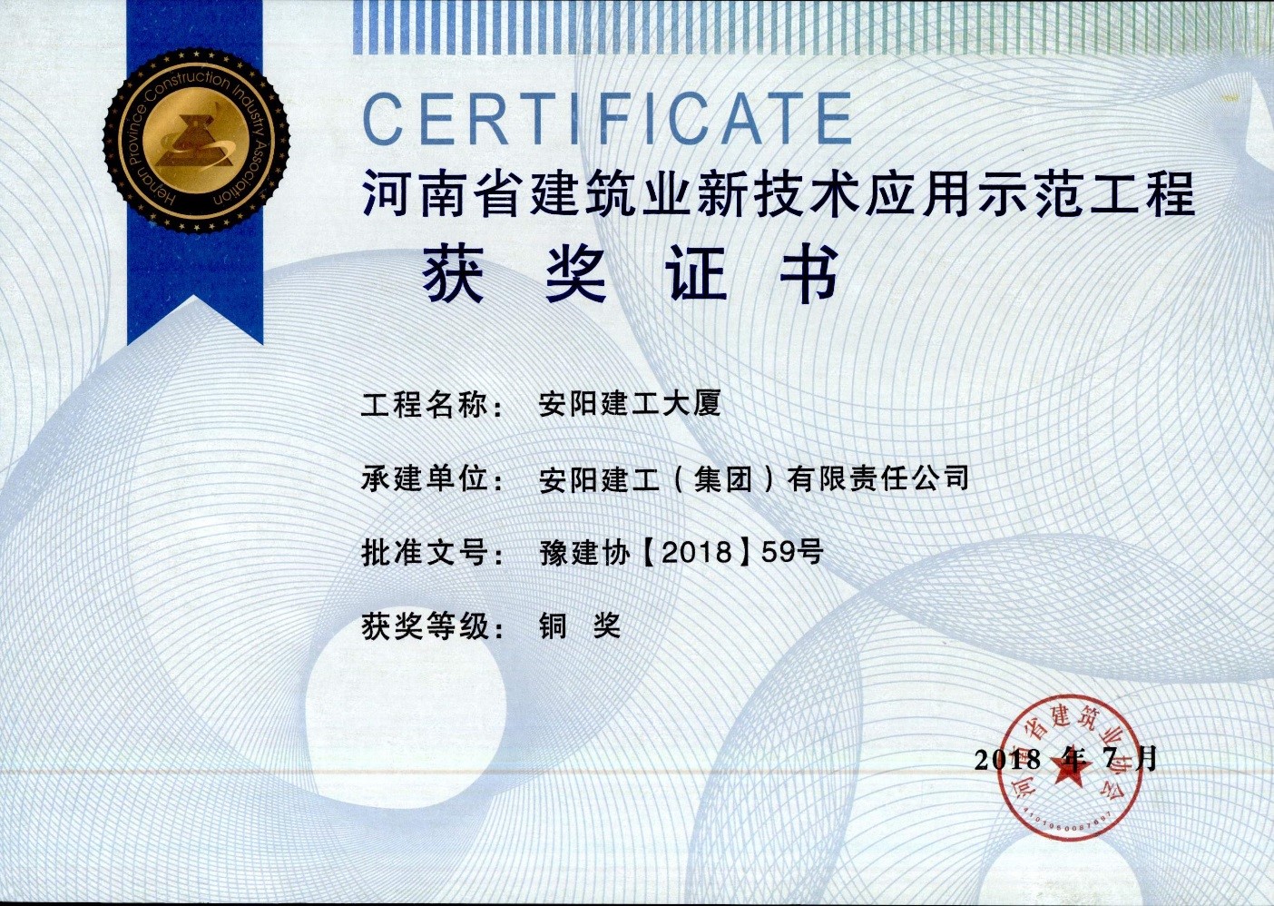 我公司安陽(yáng)建工大廈項(xiàng)目榮獲18年省建筑業(yè)新技術(shù)應(yīng)用示范工程