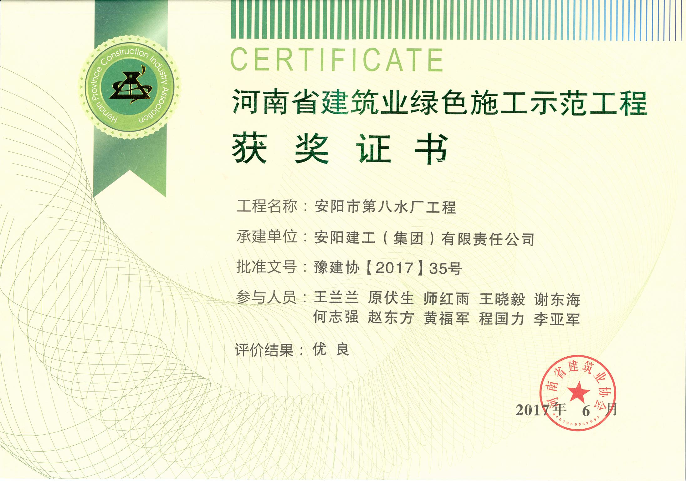 我公司安陽市第八水廠項(xiàng)目榮獲17年省建筑業(yè)綠色施工示范工程