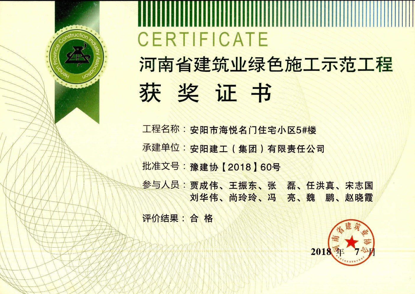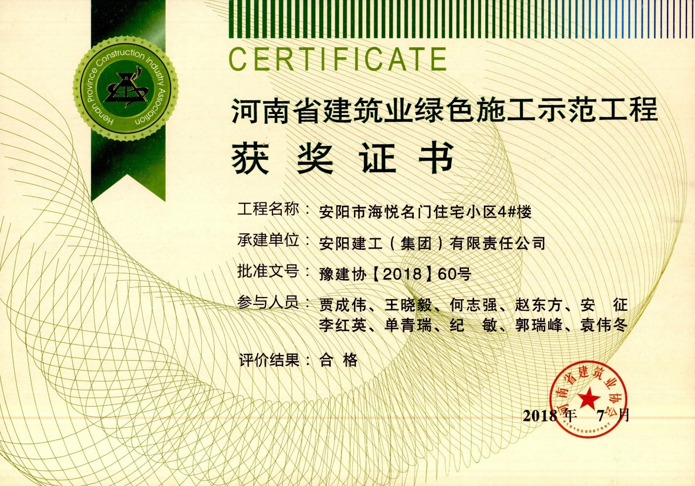 我公司安陽市海悅名門小區(qū)4#5#樓項(xiàng)目榮獲18年省建筑業(yè)綠色施工示范工程