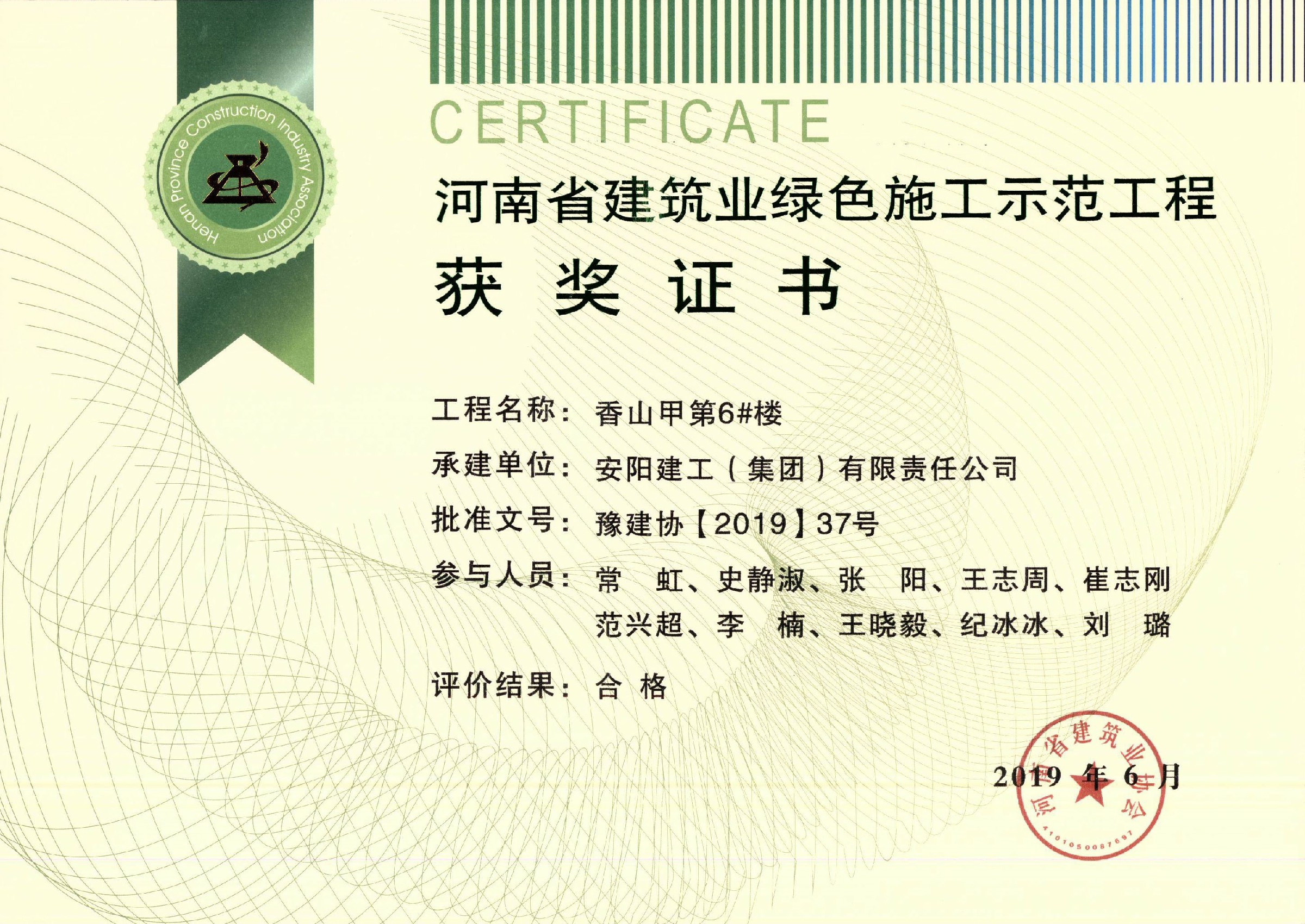 我公司安陽市香山甲第6#樓項目榮獲19年省建筑業(yè)綠色施工示范工程