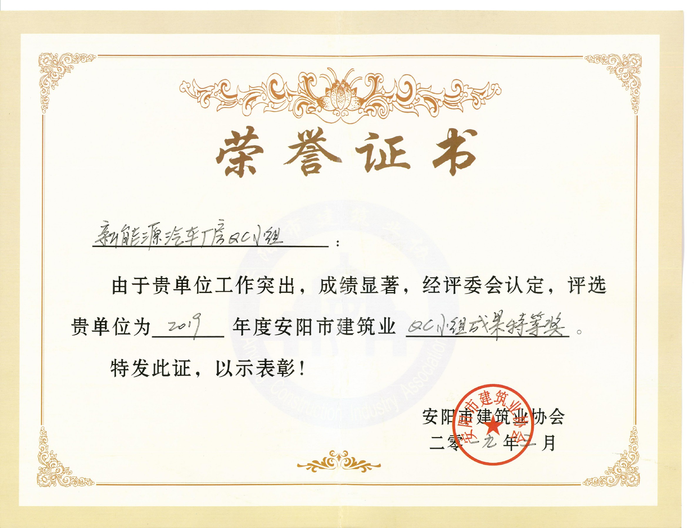 我公司新能源汽車廠房QC小組榮獲2019年安陽市建筑業(yè)QC小組成果特等獎