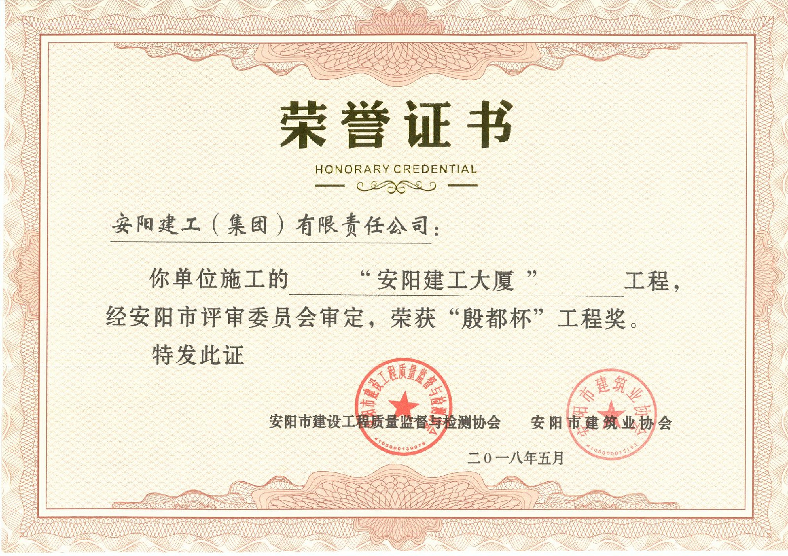 我公司承建的安陽(yáng)市建工大廈項(xiàng)目榮獲2018年度安陽(yáng)市殷都杯工程獎(jiǎng)