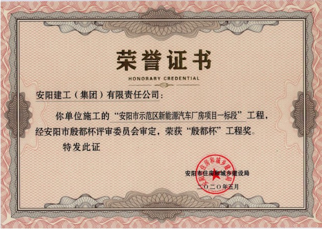 我公司承建的安陽(yáng)新能源汽車廠房項(xiàng)目一標(biāo)段榮獲2020年度安陽(yáng)市殷都杯工程獎(jiǎng)