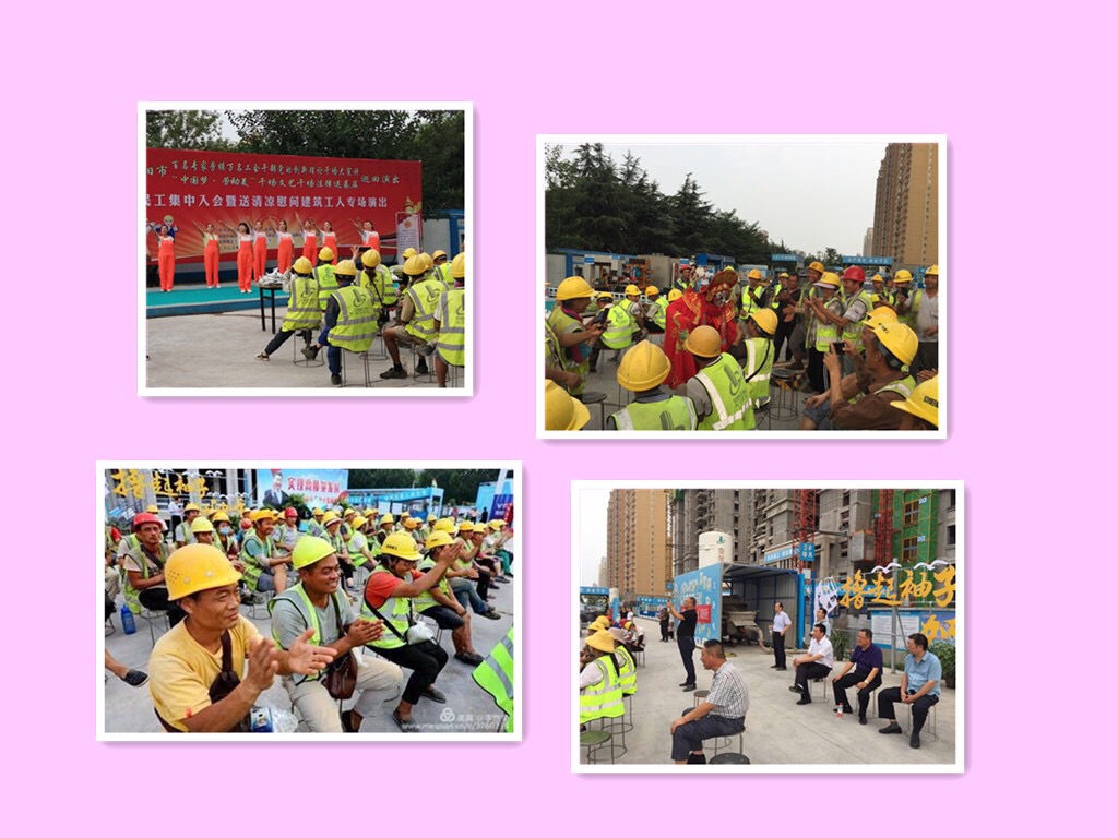 7月21日下午,農(nóng)民工集中入會(huì)暨送清涼慰問(wèn)建筑工人專場(chǎng)演出活動(dòng),在安陽(yáng)建工集團(tuán)海悅名郡工程項(xiàng)目施工現(xiàn)場(chǎng)舉行,安陽(yáng)市總工會(huì)黨組成員、副主席朱繼衡,安陽(yáng)市城建交通水利工會(huì)主席梁曦、副主席靳遠(yuǎn),安陽(yáng)市建筑業(yè)項(xiàng)目工會(huì)聯(lián)合會(huì)主席郜慶,安陽(yáng)市建筑業(yè)協(xié)會(huì)秘書長(zhǎng)陶思孝,建筑業(yè)協(xié)會(huì)副秘書長(zhǎng)、安陽(yáng)建工集團(tuán)董事劉艷軍,安陽(yáng)建工集團(tuán)工會(huì)主席馬松林,安陽(yáng)建工集團(tuán)副總經(jīng)理劉民等相關(guān)同志,來(lái)到工地現(xiàn)場(chǎng)參加了活動(dòng)。