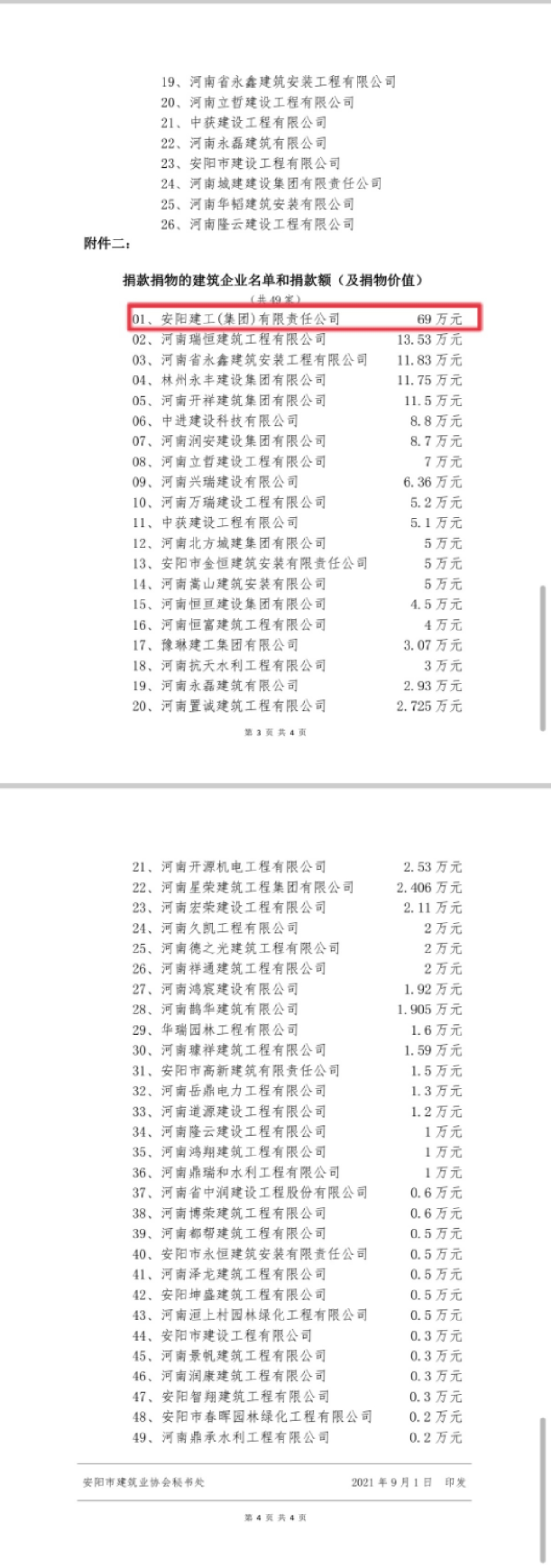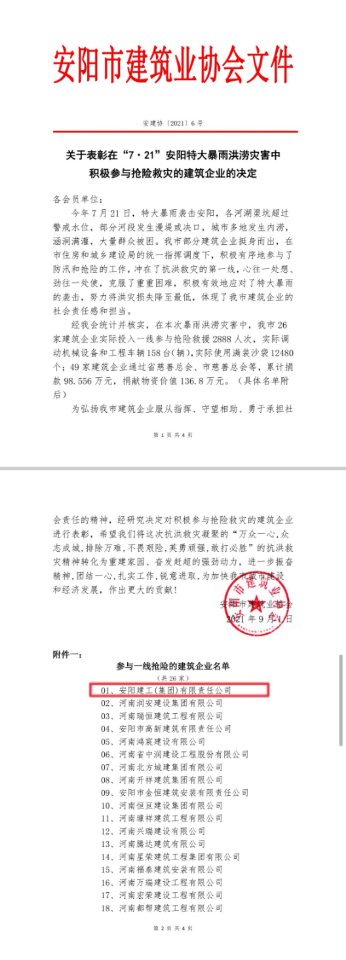 為弘揚我市建筑業(yè)企業(yè)服從指揮、守望相助、勇于承擔社會責任的精神,近日,安陽市建筑業(yè)協(xié)會發(fā)文對“7.21”特大暴雨洪澇災害中積極參與搶險救災的建筑企業(yè)進行表彰,安陽建工集團喜被提名。