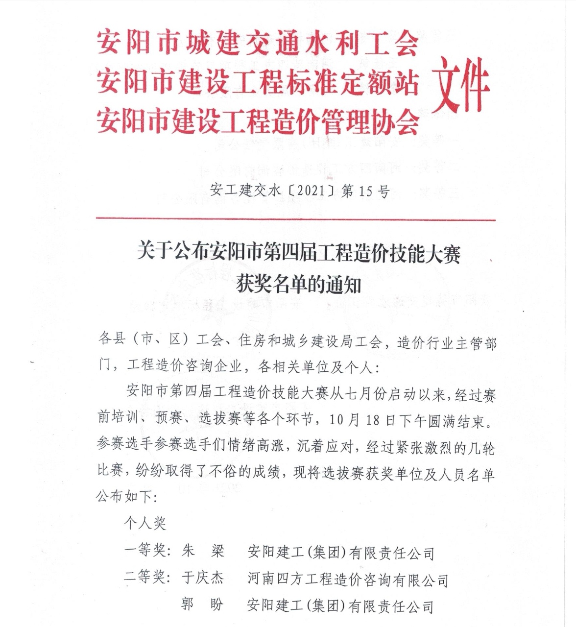 喜訊!安陽建工集團(tuán)在“安陽市第四屆工程造價(jià)技能大賽”中