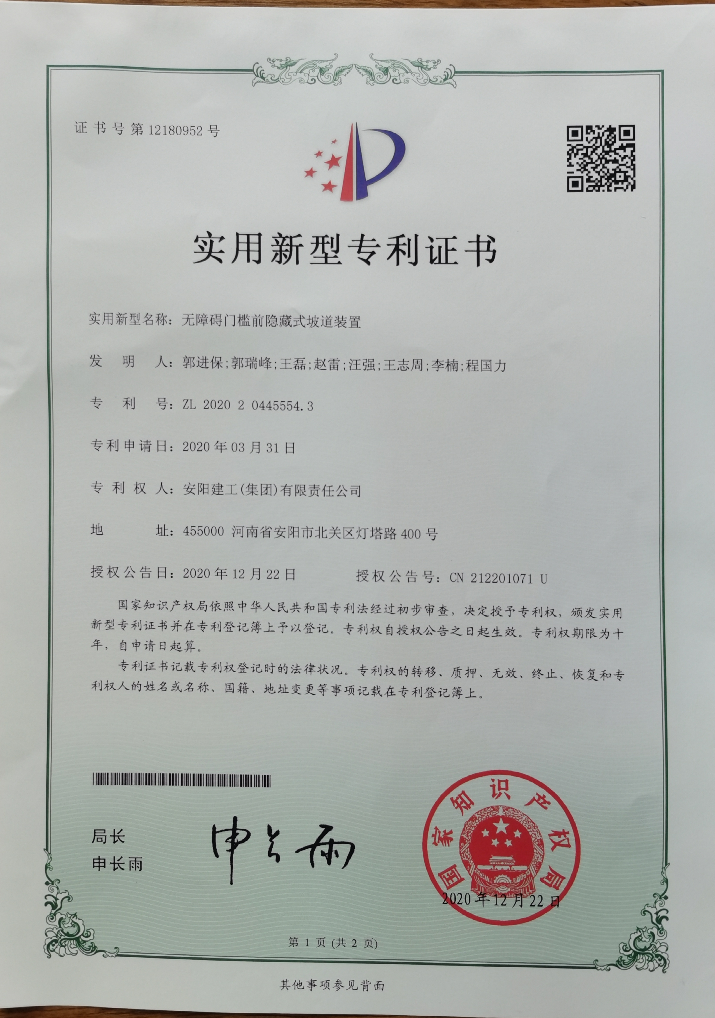 我公司隱藏式坡道裝置實用新型專利