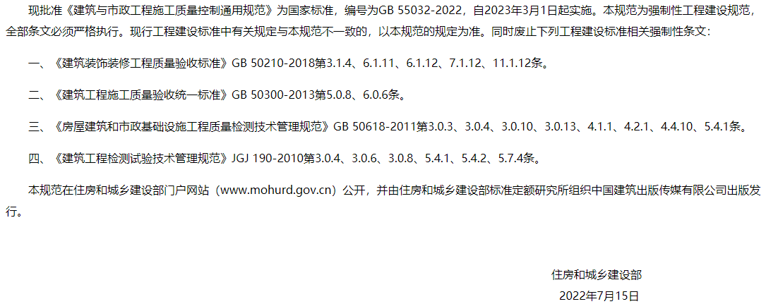 原文鏈接及附件下載:住房和城鄉(xiāng)建設(shè)部關(guān)于發(fā)布國家標(biāo)準(zhǔn) 《建筑與市政工程施工質(zhì)量控制通用規(guī)范》的公告 https://www.mohurd.gov.cn/gongkai/fdzdgknr/zfhcxjsbwj/202208/20220825_767714.html