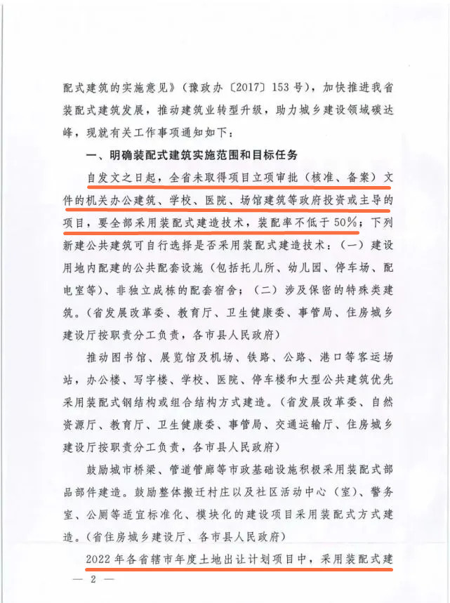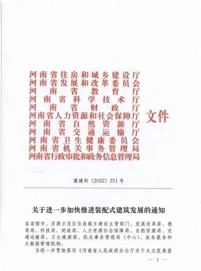 近日,河南省住建廳、省發(fā)改委等11個部門聯(lián)合印發(fā)了《關(guān)于進一步加快推進裝配式建筑發(fā)展的通知》。通知要求,自發(fā)文之日起,全省未取得項目立項審批(核準、備案)文件的機關(guān)辦公建筑、學(xué)校、醫(yī)院、場館建筑等政府投資或主導(dǎo)的項目,要全部采用裝配式建造技術(shù),裝配率不低于50%。