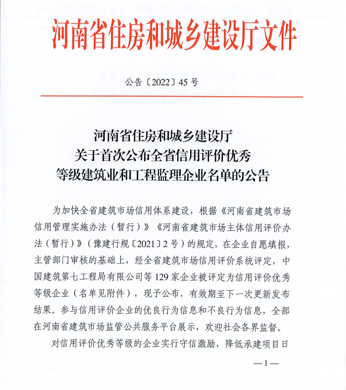 9月2日,河南省住房和城鄉(xiāng)建設(shè)廳發(fā)布《關(guān)于首次公布全省信用評(píng)價(jià)優(yōu)秀等級(jí)建筑業(yè)和工程監(jiān)理企業(yè)名單的公告》,我公司喜獲“信用評(píng)價(jià)優(yōu)秀等級(jí)建筑業(yè)企業(yè)”榮譽(yù)。加強(qiáng)建筑市場信用體系建設(shè)是我國“十四五建筑業(yè)發(fā)展規(guī)劃”中明確的一項(xiàng)主要任務(wù)。為加快推進(jìn)全省建筑市場信用體系建設(shè),河南省住房和城鄉(xiāng)建設(shè)廳于2021年7月印發(fā)了《河南省建筑市場主體信用評(píng)價(jià)辦法(暫行)》(豫建行規(guī)[2021]2號(hào)),對于入選本次信用評(píng)價(jià)優(yōu)秀等級(jí)的企業(yè),將實(shí)行守信激勵(lì),降低承建項(xiàng)目日常監(jiān)督檢查頻率,列為政策支持、媒體推介、評(píng)優(yōu)樹先等優(yōu)先選擇對象,且適當(dāng)降低工程擔(dān)保與保險(xiǎn)費(fèi)率。在全省工程建設(shè)項(xiàng)目公開招投標(biāo)時(shí),信用評(píng)價(jià)結(jié)果權(quán)重應(yīng)占10%以上。采用最低價(jià)評(píng)標(biāo)的,信用評(píng)價(jià)結(jié)果權(quán)重應(yīng)不低于30%。