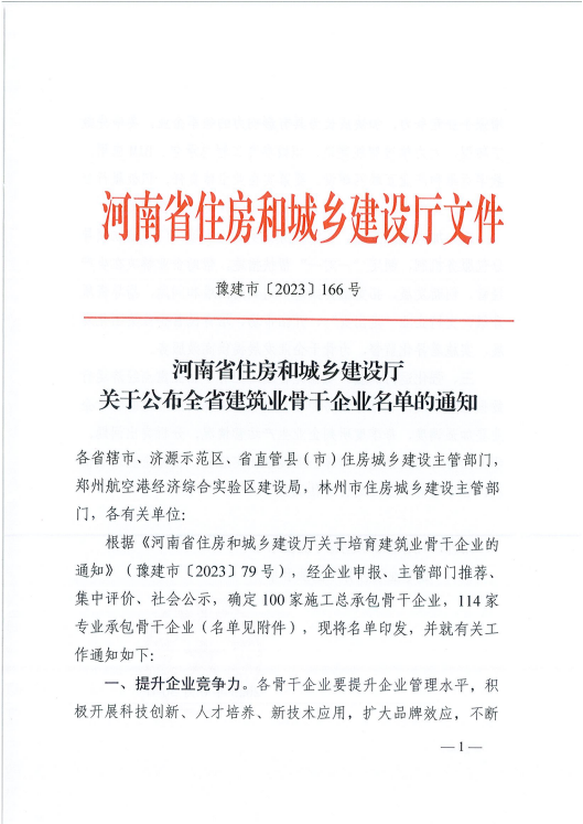近日,河南省住房和城鄉(xiāng)建設(shè)廳發(fā)文,公布全省建筑業(yè)骨干企業(yè)名單,經(jīng)審核認(rèn)定,我集團(tuán)公司榮獲“河南省建筑業(yè)施工總承包骨干企業(yè)”,成為2023年評(píng)選出的100家“施工總承包骨干企業(yè)”之一。