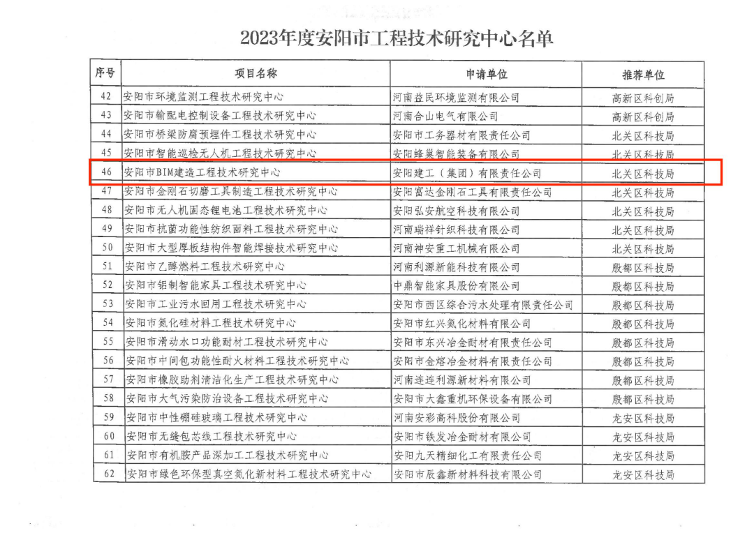 2023年9月,安陽市科技局發(fā)布了《關(guān)于認定2023年度安陽市工程技術(shù)研究中心和重點實驗室的通知 》(安科〔2023〕84號),我公司申請組建的“安陽市BIM建造工程技術(shù)研究中心”經(jīng)過積極申報,主管部門層層審核,被成功認定為“安陽市工程技術(shù)研究中心”,這是對我公司具備行業(yè)領(lǐng)先的研究開發(fā)與創(chuàng)新能力的認可。