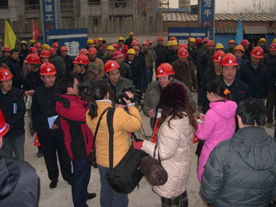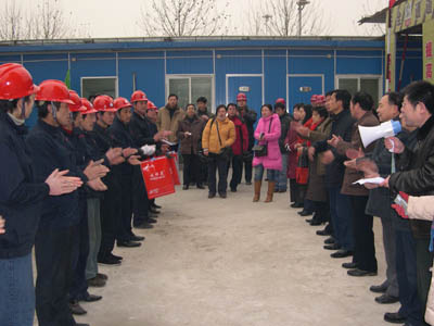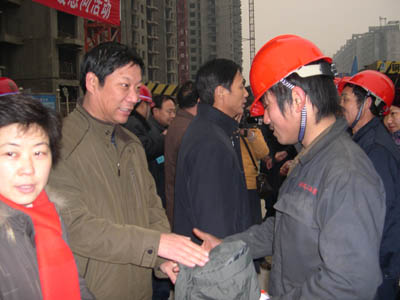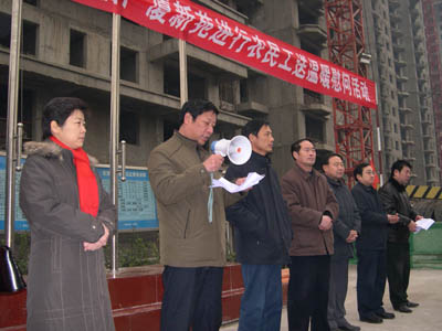 2008年1月10日是一個普通的日子,但對于建工(集團(tuán))廣廈工地上的農(nóng)民工來說卻是難忘的一天。這一天天氣格外寒冷,氣溫驟降給建筑工人戶外作業(yè)增加了勞動難度和強(qiáng)度。安陽建工(集團(tuán))各建筑工地上的工人師傅們和往常一樣仍堅守在各自的工作崗位上,依然認(rèn)真工作、辛勤勞動著,他們絲毫沒有因為外部條件艱苦而影響了工作。安陽市總工會主席聶孟磊、副主席陰春生、保障部部長呂啟霞 、城建水利工會主席陳亮等一行在這一天帶著100件羽絨服、100本《農(nóng)民工知識讀本》和對廣大農(nóng)民工的一片關(guān)愛來到了廣廈新苑工地,為那里的農(nóng)民工送去了溫暖。公司領(lǐng)導(dǎo)謝海如、馬松林、鐘新安及市機(jī)關(guān)事務(wù)管理局廣廈新苑指揮部人員參加了這次送溫暖活動。公司黨委副書記、工會主席馬松林主持儀式。