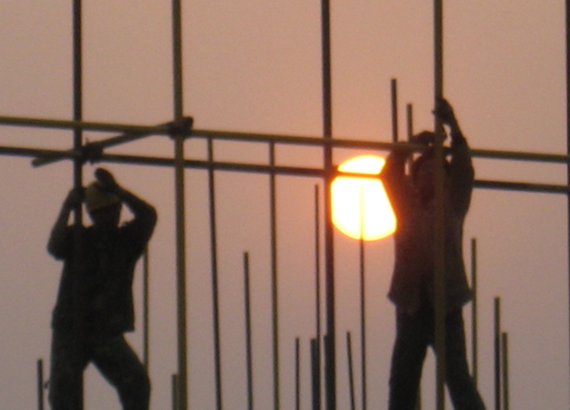 安陽(yáng)建工集團(tuán)承建的新鄉(xiāng)博物院工程是新鄉(xiāng)市的重點(diǎn)工程項(xiàng)目,建成后是一座用于服務(wù)公眾、傳承文化、展示形象的標(biāo)志性建筑。為了工程的順利建成,從2007115開(kāi)工以來(lái),我們舉全公司之力,從建設(shè)最高的質(zhì)量出發(fā),調(diào)動(dòng)了最好的技術(shù)人員,一流的施工設(shè)備和經(jīng)驗(yàn)豐富的施工隊(duì)伍,投入了大量的人、財(cái)、物等各種資源,全力投入到了為新鄉(xiāng)市的重點(diǎn)工程建設(shè)之中。目前該該工程進(jìn)入主體一層收尾階段,當(dāng)前正值春暖花開(kāi),為了抓住這大好的施工季節(jié),趕工期、保質(zhì)量,新鄉(xiāng)博物院項(xiàng)目部全體員工正在夜以繼日、加班加點(diǎn)的緊張施工,他們正在用辛勤的汗水編織美好的明天。(圖為職工在夕陽(yáng)的映襯下搭設(shè)腳手架)