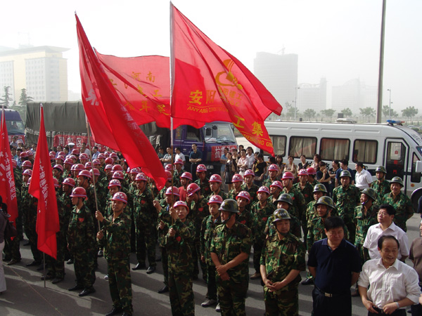 帶著建工人的重托,帶著建工人對(duì)災(zāi)區(qū)群眾的深情厚意,5月28日早上7:00,安陽建工集團(tuán)安裝公司15名干部職工組成的第一支抗震救災(zāi)先遣隊(duì)伍,在安陽市建委的統(tǒng)一安排下,從安陽集結(jié)出發(fā),奔赴四川綿陽災(zāi)區(qū)援助災(zāi)后重建。歡送儀式在集團(tuán)公司隆重舉行,公司領(lǐng)導(dǎo)及廣大員工為隊(duì)員壯行,安裝公司經(jīng)理程運(yùn)保領(lǐng)著胸戴大紅花的突擊隊(duì)員走進(jìn)會(huì)場時(shí),大家起立鼓掌并向他們致以崇高的敬意!在歡送儀式上,集團(tuán)公司董事長、總經(jīng)理謝海如向先遣隊(duì)授旗,公司副總盧麗娜主持歡送儀式。