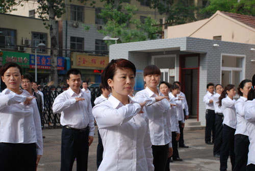 每天清晨,迎著噴薄而出的朝陽,員工統(tǒng)一著裝,整齊列隊,在音樂的伴奏下集體做大眾廣播體操。員工們一絲不茍的神態(tài),筆挺高雅的工裝,整齊劃一的動作,吸引了路人的駐足觀看,成為一道靚麗的風景線。